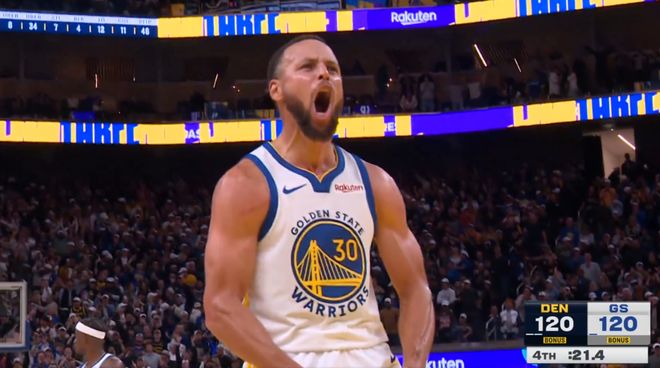 库里第四节最后时刻命中超远扳平三分,怒吼庆祝拖进加时赛。